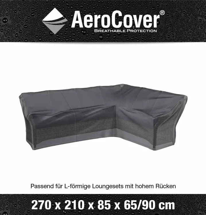 Atmungsaktive Lounge-Set-Hülle für L-förmige Loungesets mit hoher Rückenlehne 270x210x85xH 65/90 cm mit 90° Ecke. Aus sitzender Perspektive ist die rechte Seite (270 cm) länger als die linke (210 cm). Das atmungsaktive AeroCover-Gewebe ist wasserabweisend und reduziert die Kondensbildung. Zudem sorgt die AeroCover-Membran dafür, dass die Bildung von Mehltau und Schimmel vermieden wird. AeroCover Schutzhüllen verlängern die Lebensdauer Ihrer Gartenmöbel. AeroCovers sind aus leichtem Ripstop Polyester mit einer integrierten, atmungsaktiven Membran hergestellt. Dank des dünnen Gewebes sind diese Hüllen besonders handlich in der Anwendung. Bei Nichtgebrauch sind sie platzsparend aufzubewahren und nehmen, auch dank der integrierten Aufbewahrungstasche, sehr wenig Platz ein. Die Hülle ist mit einem Zugband mit zwei Stoppern ausgestattet. Zudem sind an den Ecken Befestigungsschnallen angebracht, so dass eine optimale Passform sichergestellt ist. Das AeroCover-Gewebe ist 100% wasserdicht, die Nähte sind spritzwasserfest.