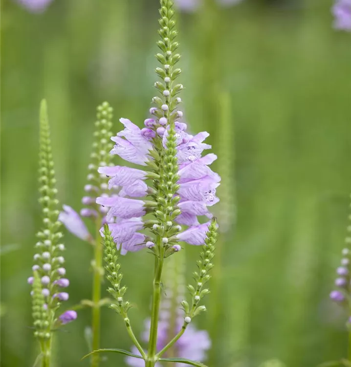 Physostegia virginiana 'Rosea' bildet lippenförmige, in Ähren angeordnete, rosafarbene Blüten ab Juli.