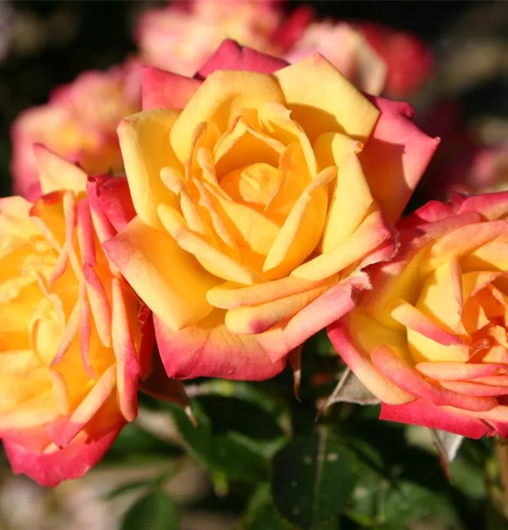 Die Zwergrose 'Little Sunset'® (Rosa) ist eine reichblühende Rose, die im Garten eine besondere Rolle spielt. Die starkgefüllten Blüten sind gelb-rot und erscheinen zahlreich von Juni bis Oktober. Mit den richtigen Begleitern an ihrer Seite, kommt die Königin der Blumen besonders gut zur Geltung. Niedrige Stauden, Lavendel und Salbei eignen sich ganz gut für diese Zwecke.