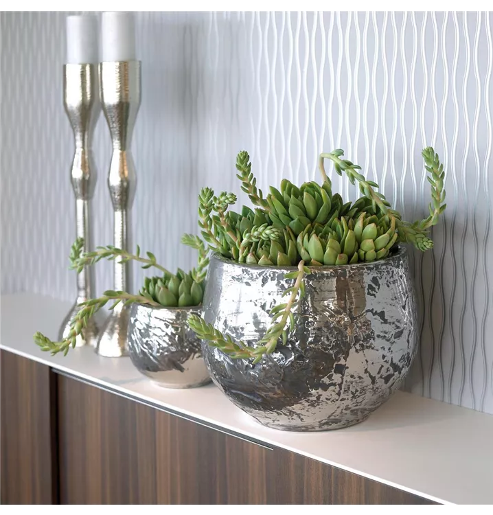 Einen spannenden Kontrast zu Pflanzen und Blumen bieten die LUXURY Schalen, Vasen und Pflanzgefäße. Hergestellt aus Keramik und dank ihres antiken Chrom-Looks wirken sie rustikal, stark und elegant zugleich und sind dekoriert ein toller Blickfang. Die Gefäße sind nicht wasserdicht (anders als im Katalog beschrieben), so dass die Verwendung von Inlinern empfohlen wird.